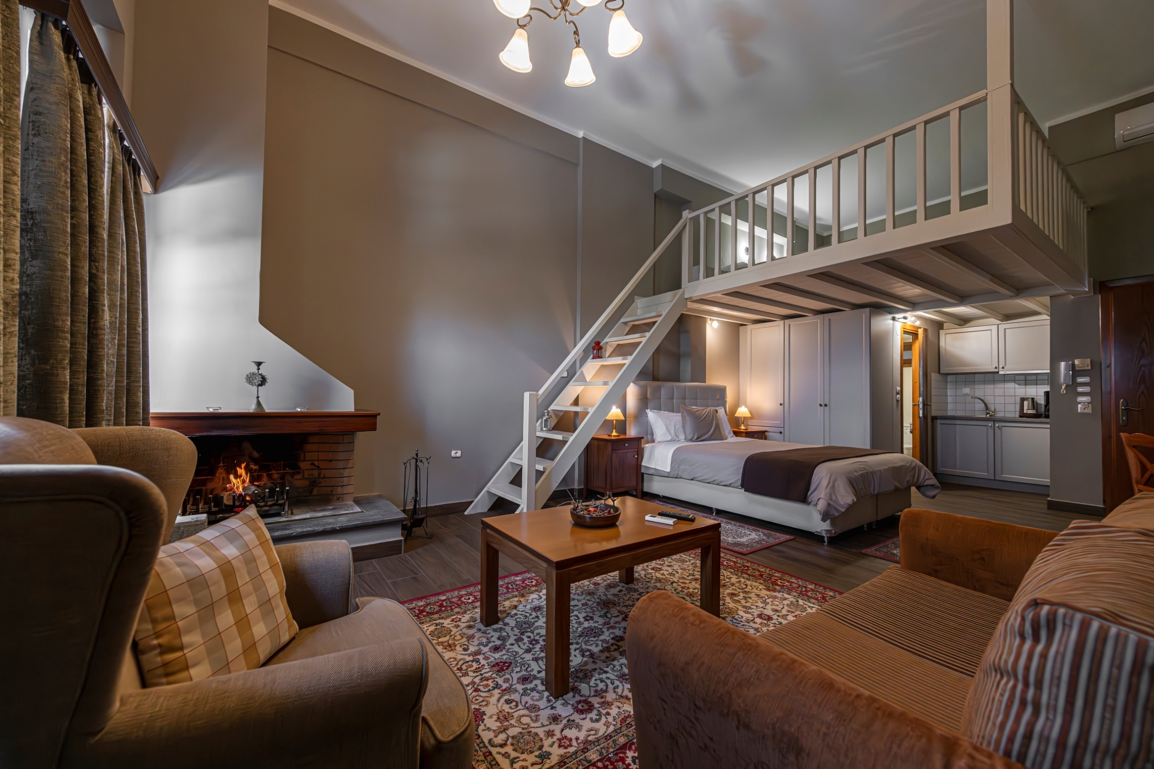 Ένας φιλόξενος χώρος δύο επιπέδων που αποπνέει οικειότητα, ζεστασιά και χαλάρωση. Η ξύλινη διακόσμηση κυριαρχεί, προσθέτοντας χαρακτήρα, ενώ το αναμμένο τζάκι συμπληρώνει την ατμόσφαιρα ηρεμίας.